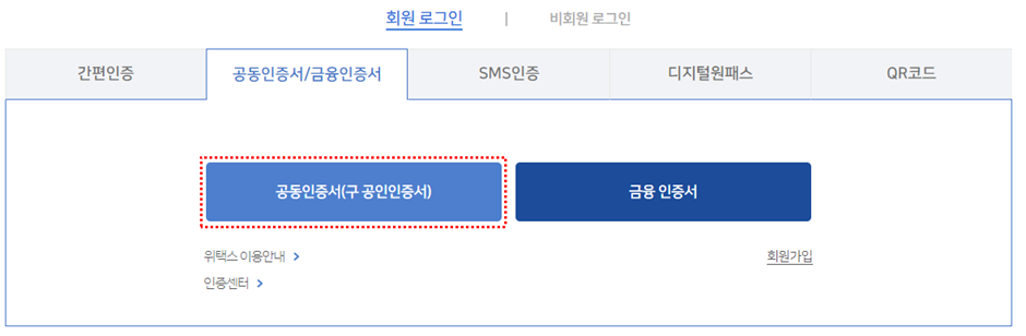 (3) 공동인증서/금융인증서를 클릭하여 공동 인증서로 로그인 합니다.