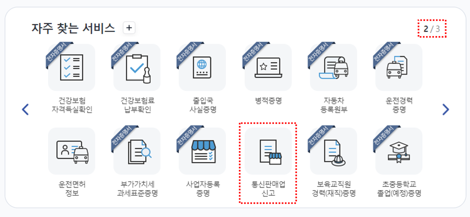 (5) 로그인한 후, 자주 찾는 서비스의 2번째란에서 통신판매업 신고를 클릭합니다.