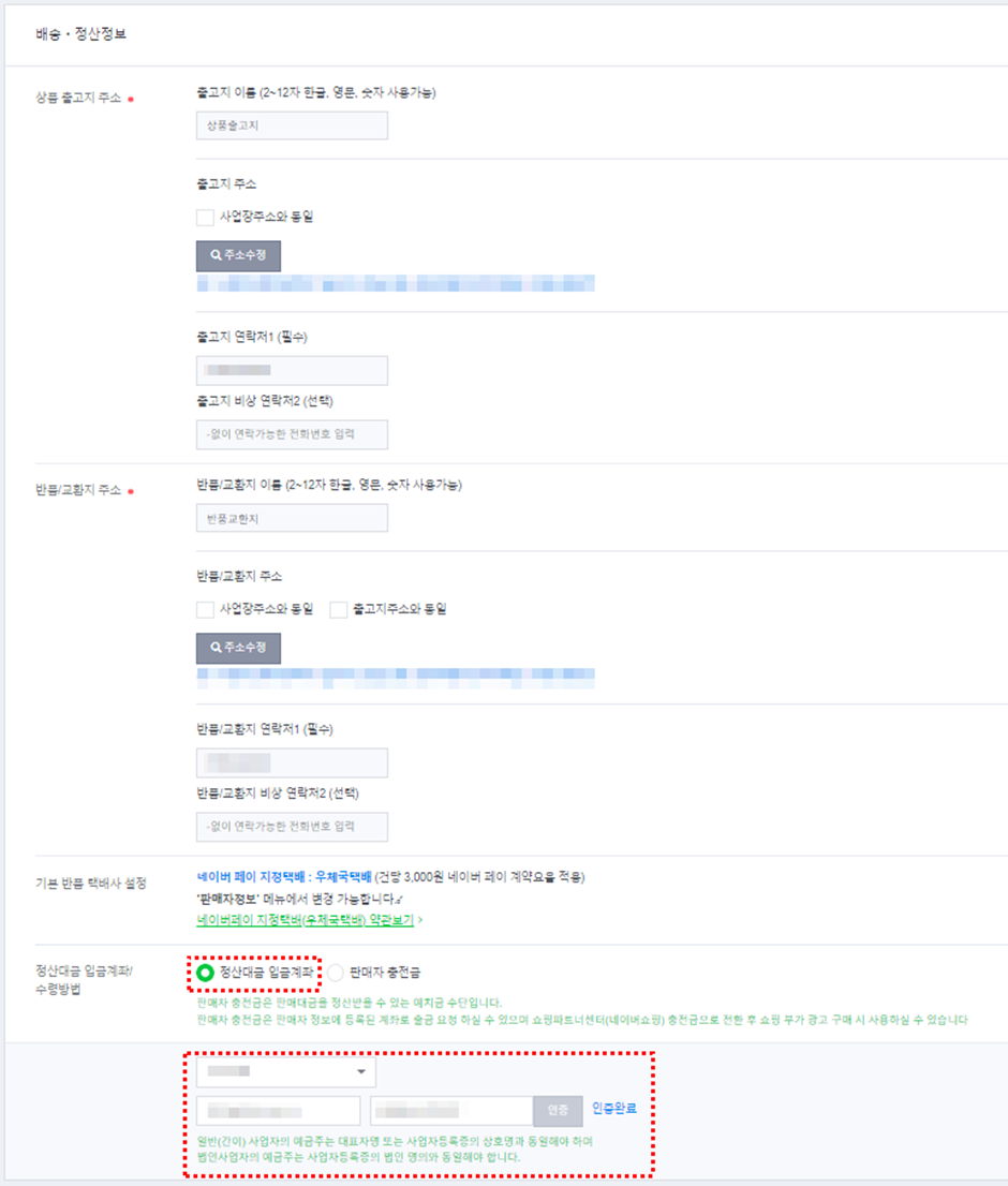 (5) 정산대금 입급계좌에 사업자 계좌를 은행명과 이름을 작성하여 인증합니다.
