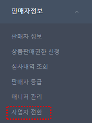(1) 판매자 정보에서 사업자전환을 클릭하여 아래의 순서대로 사업자로 전환을 합니다.