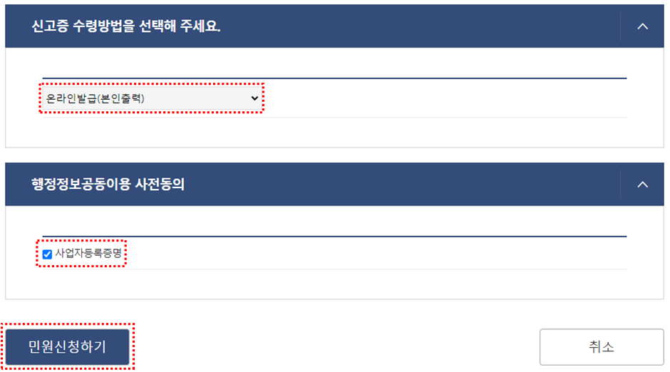 (11) 신고증 수령방법, 행정정보공동이용 사전동의 체크 후 민원 신청하기 버튼을 클릭합니다.
