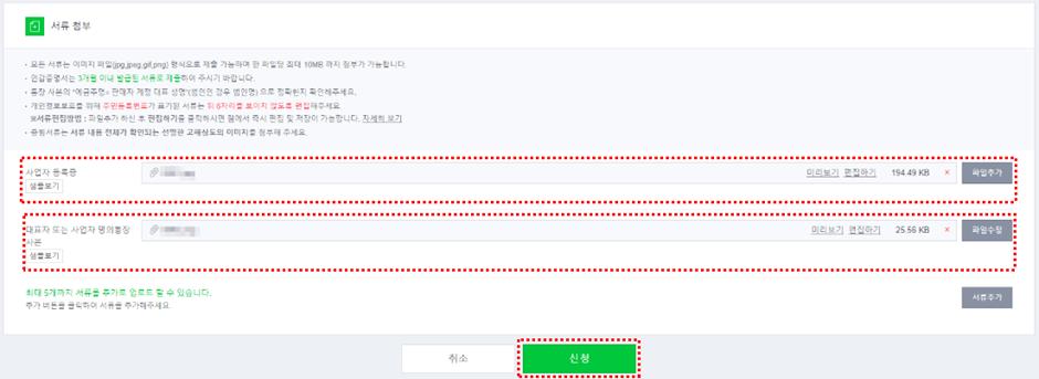 (6) 서류 첨부에 준비한 사업자등록증, 통장사본 이미지 파일을 각각 첨부합니다.